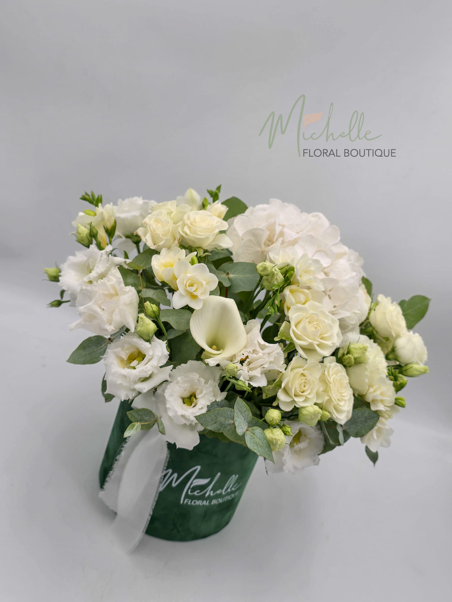 Aranajement floral in cutie de catifea format din hortensie, cale, minirosa, frezii, eustoma, eucalipt.