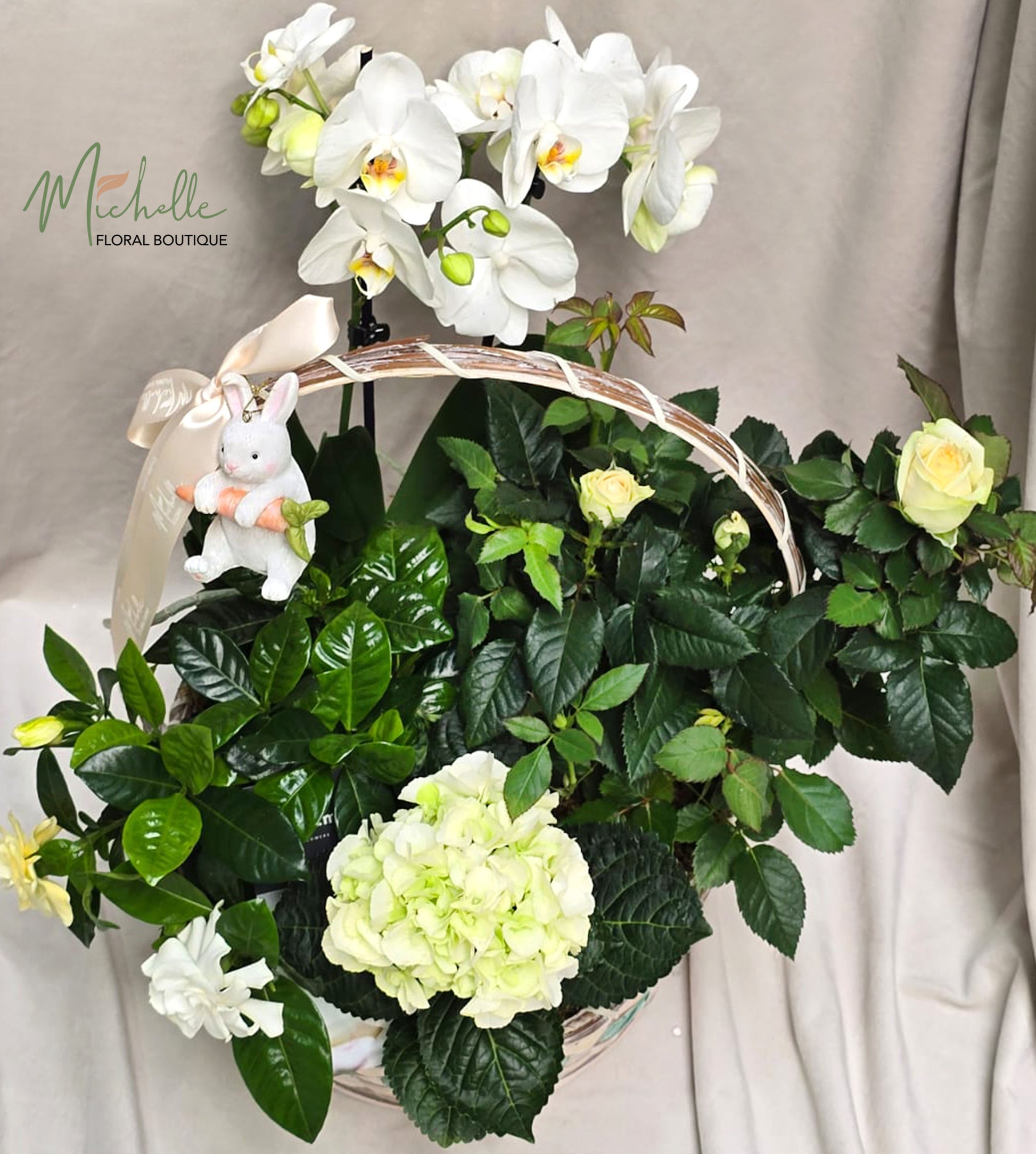 Cos elegant cu plante in ghiveci format din hortensie, minirosa, gardenie, orhidee midi si figurina din ceramica.