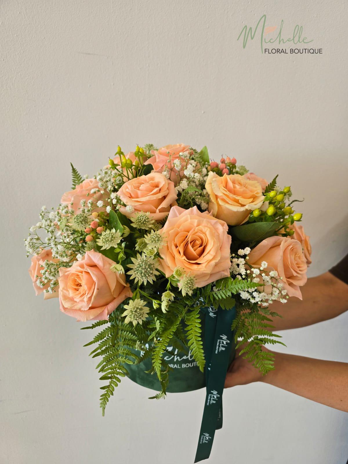 Aranjament in cutie de catifea Michelle Floral Boutique si contine 11 trandafiri, 5 hypericum, bupleurum, gypsofila, banda din satin Floraria Michelle Floral Boutique.