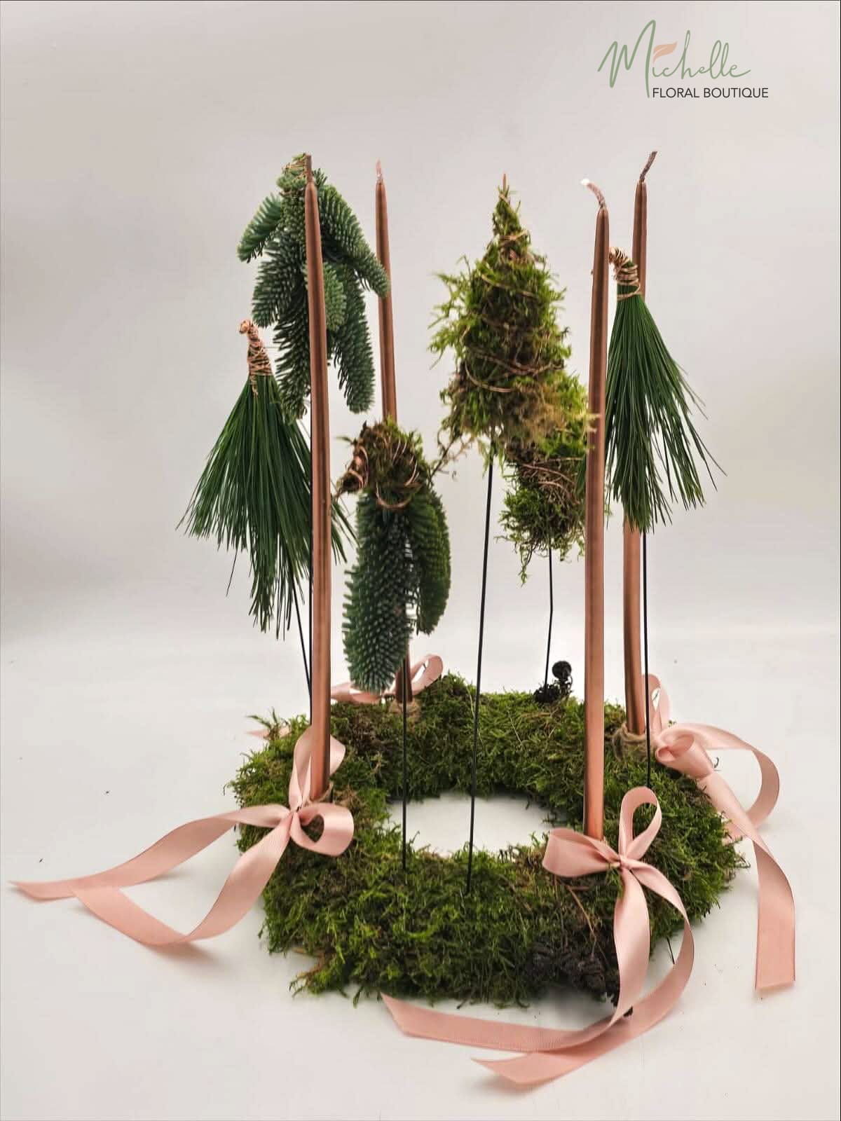 Coronita imbracata in muschi natural cu accesorii si lumanari de calitate superioara.
