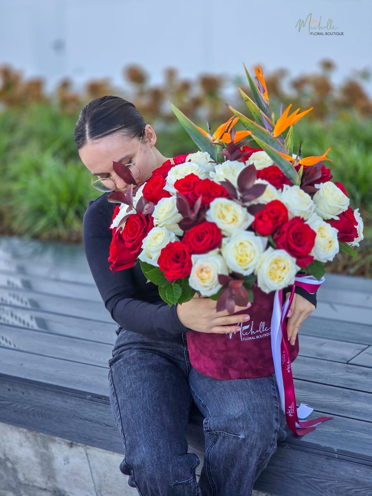 Aranjament floral delicat in cutie de catifea. Contine 50 tradafiri, 5 strelizia, ruscus si cutie de catifea.
