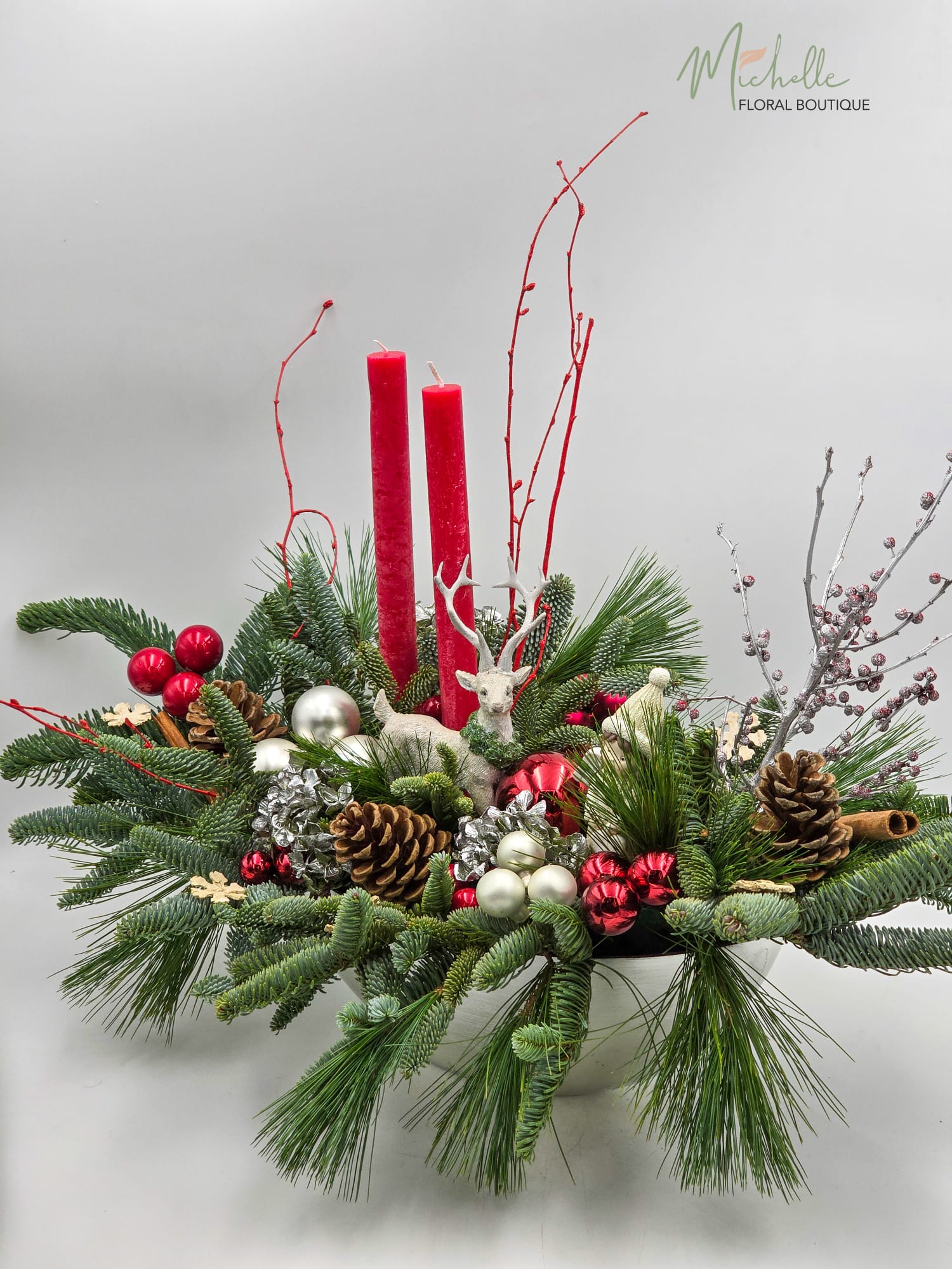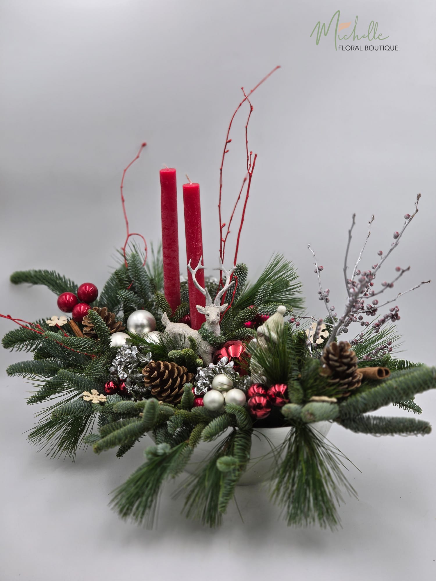 Contine o selectie de ramuri de brad parfumate, ilex vopsit, figurine din ceramica, globuri de sticla, conuri de brad, batoane de scortisoara, lumanari si accesorii.