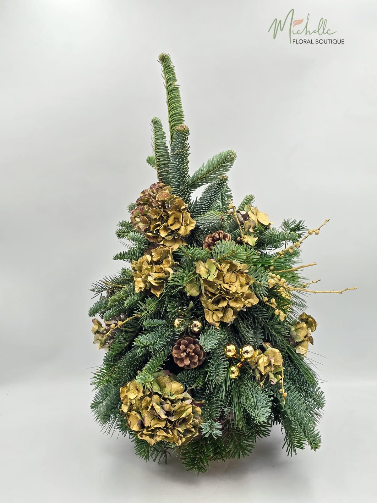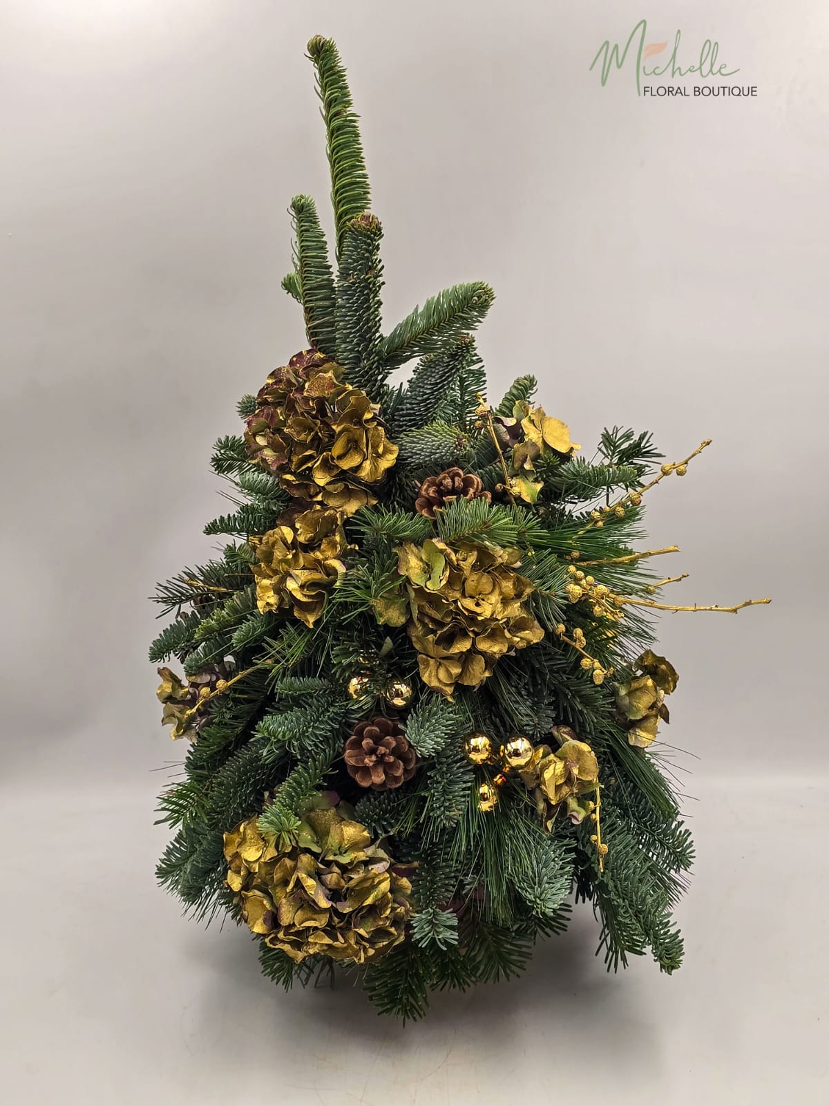 Construit in vas ceramic in burete floral umed contine o selectie de crengi de brad, hortensie aurie, globuri de sticla, ilex si alte decoratiuni menite sa intrumuseteze locul dvs preferat.