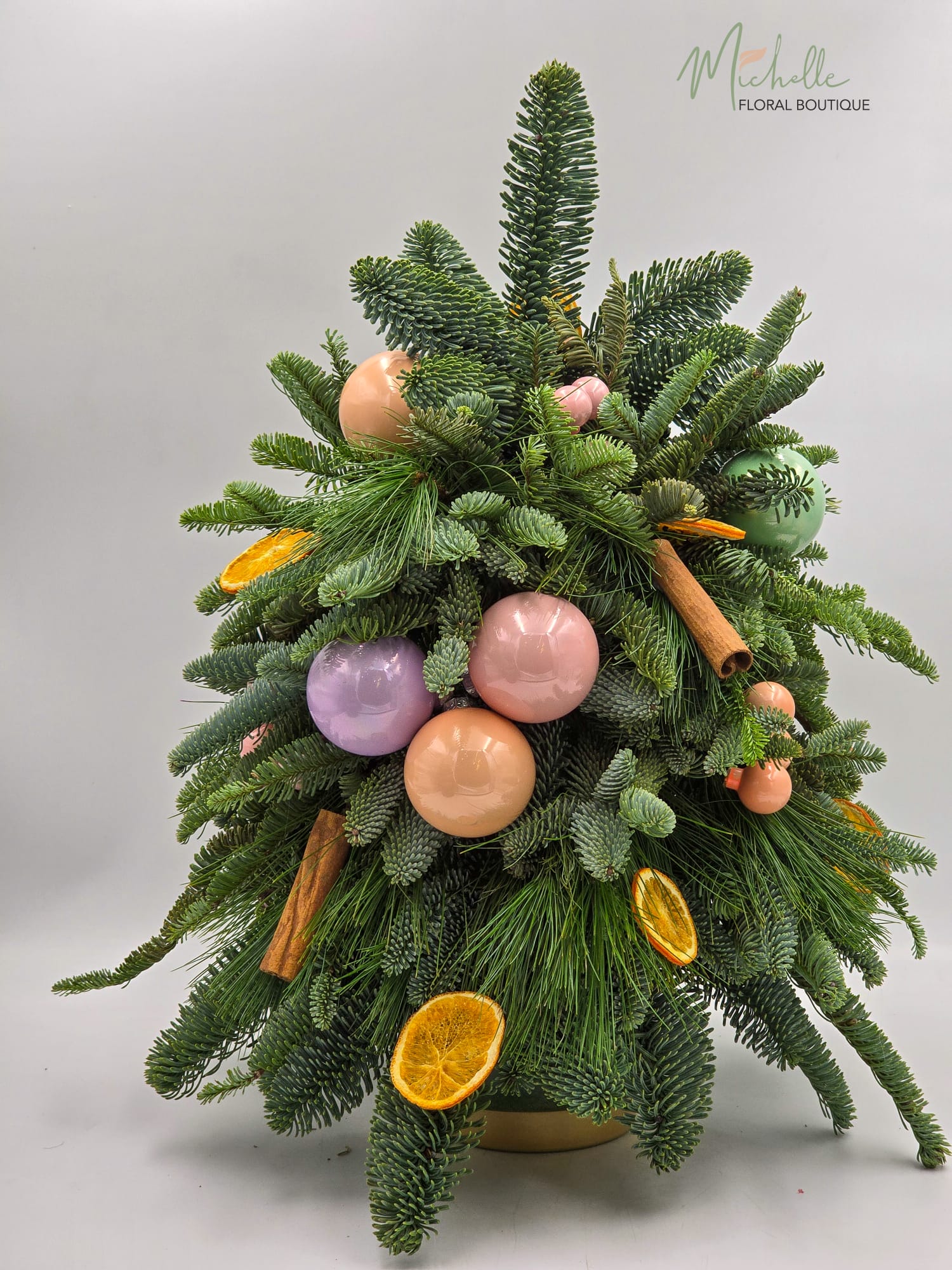 Bradut in vas ceramic construit pe baza de burete umed care contine brad white nobilis, pin, felii de portocala, scortisoara si globuri din sticla multicolore.