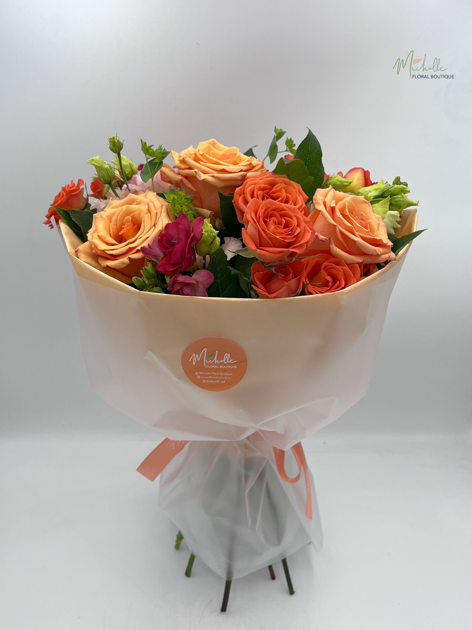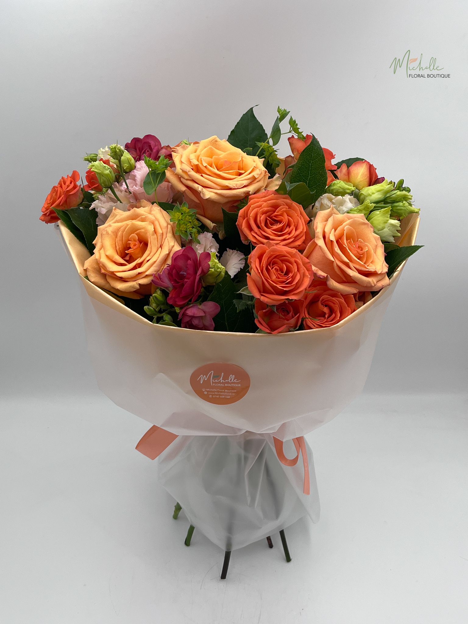 Buchet format din trandafiri, minirosa, frezii si eustoma.