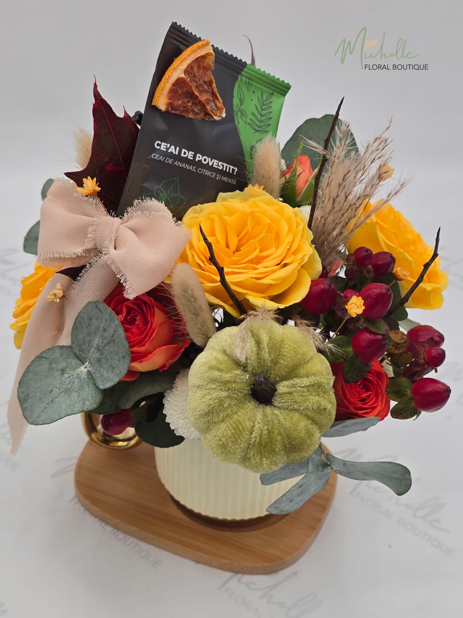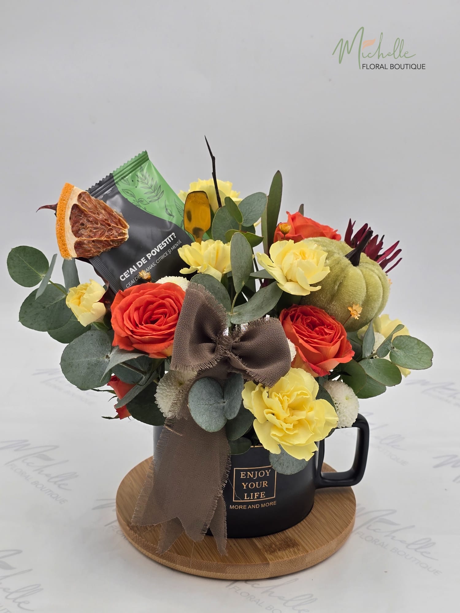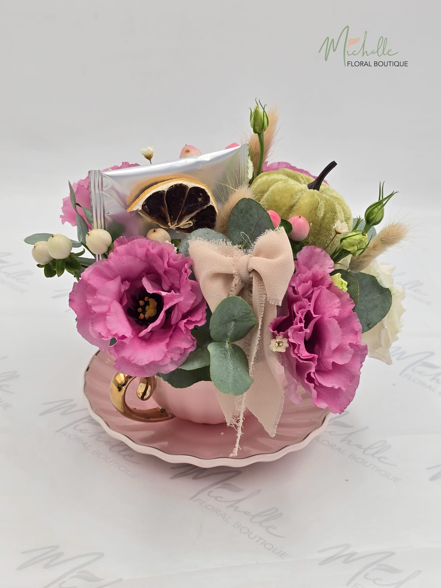 Cescute elegante din ceramica, insotite de un buchet parfumat si un plic de ceai.