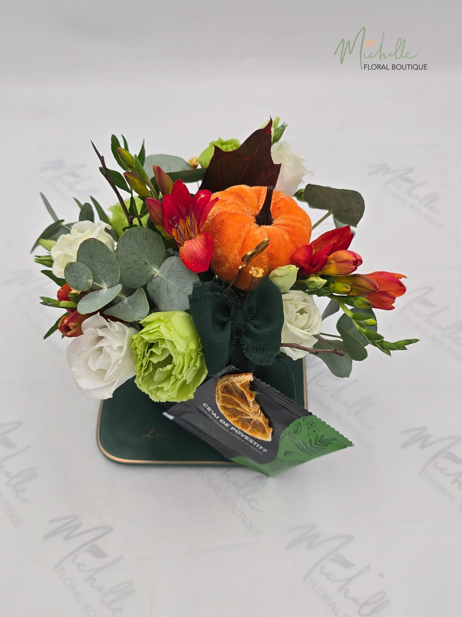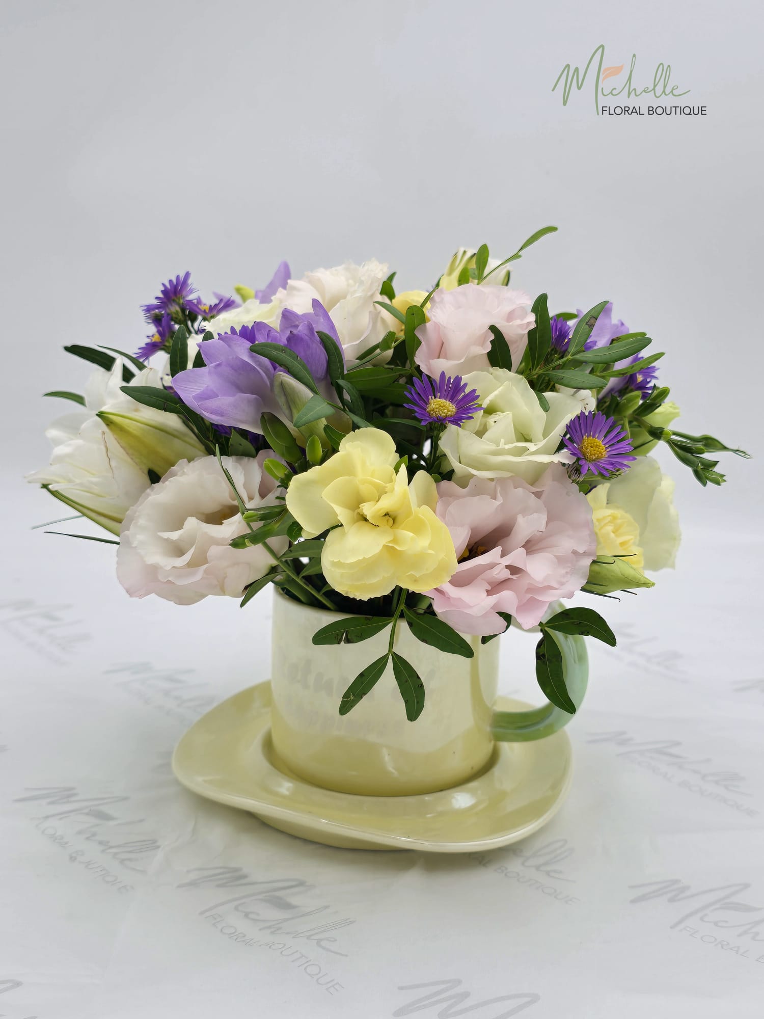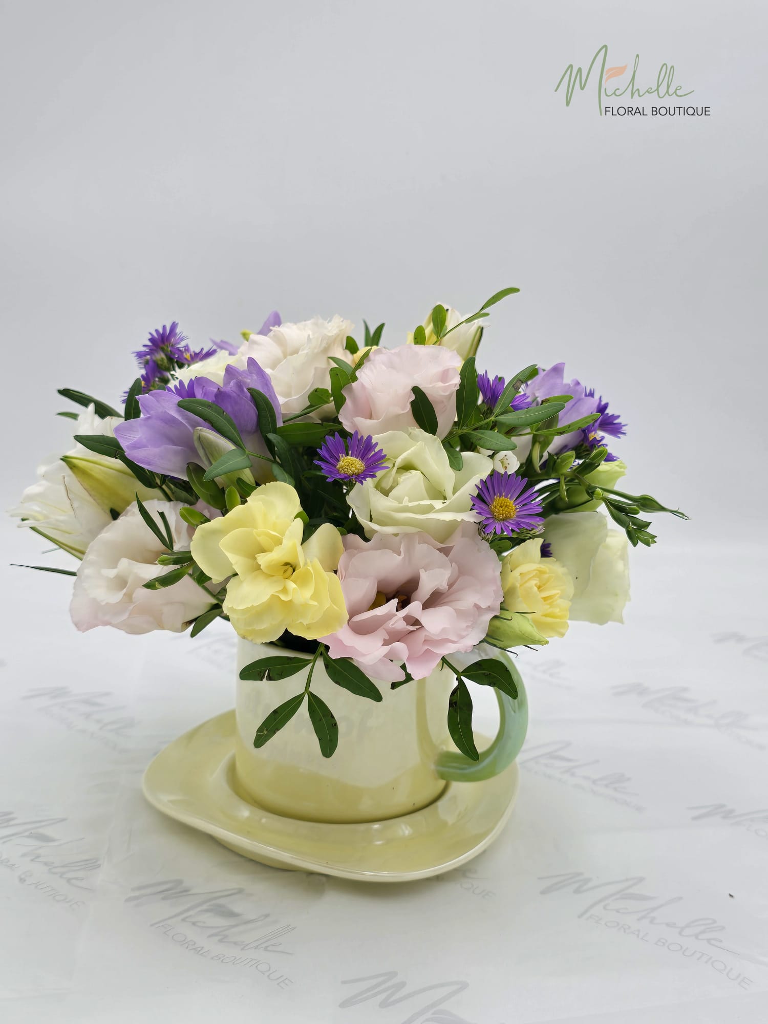 Cescute elegante din ceramica, insotite de un buchet parfumat si un plic de ceai.